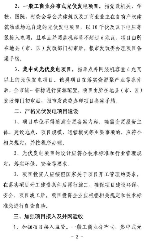 集中式光伏發(fā)電項(xiàng)目:指單點(diǎn)并網(wǎng)裝機(jī)容量6兆瓦以上的光伏發(fā)電項(xiàng)目。該類項(xiàng)目在落實(shí)資源聚產(chǎn)業(yè)等條件后,全市統(tǒng)一招標(biāo)進(jìn)行資源配置。項(xiàng)目由所在地縣(市、區(qū))發(fā)改部門初審后,報(bào)市發(fā)改委辦理項(xiàng)目備案手續(xù)。