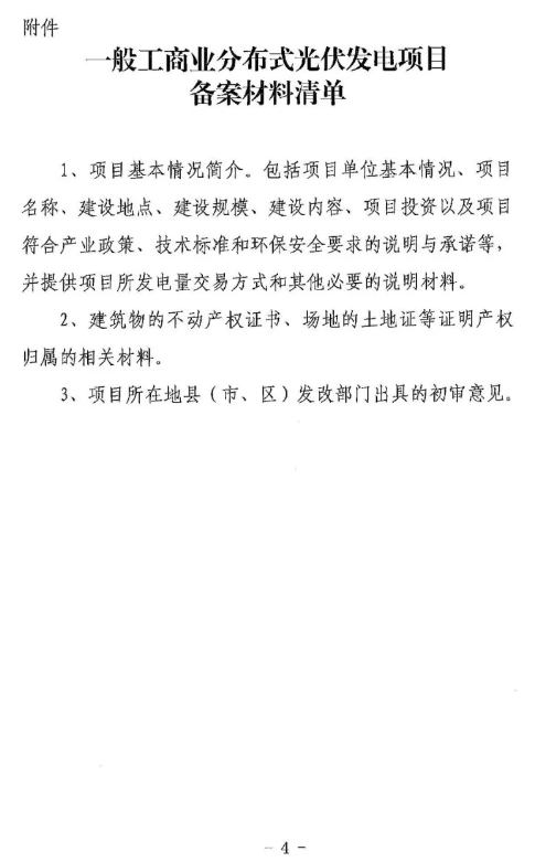 一般工商業(yè)分布式光伏發(fā)電項(xiàng)目:指黨政機(jī)關(guān),學(xué)校、醫(yī)院、村委會(huì)等公共建筑以及工商業(yè)業(yè)主在自有產(chǎn)權(quán)建筑物或場(chǎng)地自建的光伏發(fā)電項(xiàng)目,以10千伏及以下電壓等級(jí)接入電網(wǎng),且單點(diǎn)并網(wǎng)裝機(jī)容量不超過6兆瓦。項(xiàng)目由所在地縣(市、區(qū))發(fā)改部門初審后,報(bào)市發(fā)改委辦理項(xiàng)目備案手續(xù)。