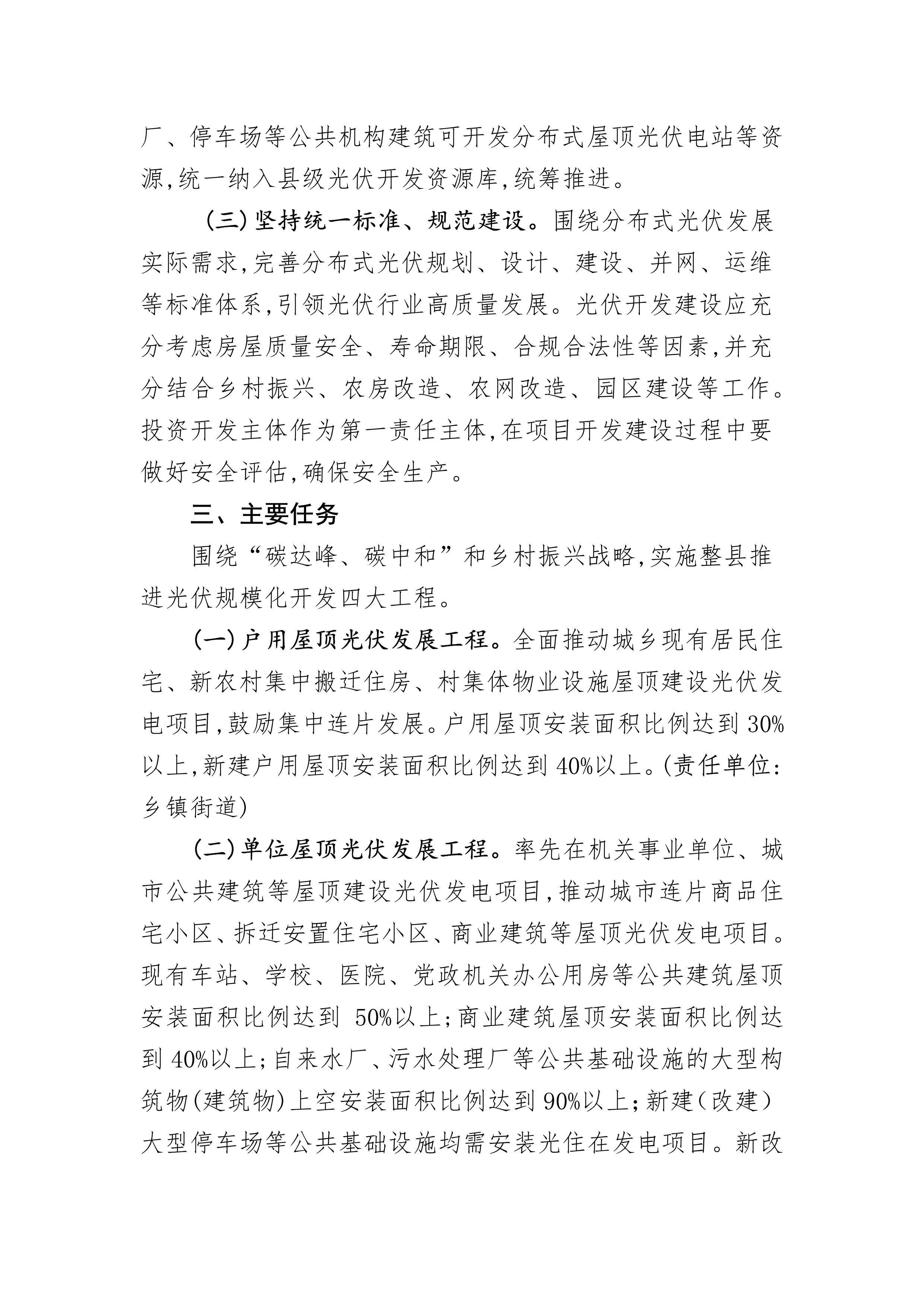 (一)戶用屋頂光伏發展工程。全面推動城鄉現有居民住宅、新農村集中搬遷住房、村集體物業設施屋頂建設光伏發電項目,鼓勵集中連片發展。戶用屋頂安裝面積比例達到30%以上,新建戶用屋頂安裝面積比例達到40%以上。